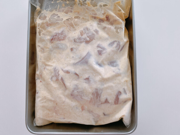 - 鶏もも肉は1口大に切る。チャック付きの保存袋にヨーグルト、塩、おろししょうが、おろしにんにく、カレー粉、1口大に切った鶏もも肉を入れて揉み込み、3時間ほど漬け込む。